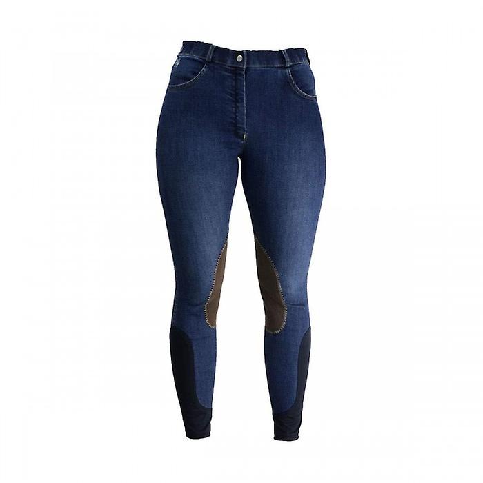 These fashionable breeches combine the stylish denim look with the practicality of breeches. Featuring contrasting brown Alos knee patches and no bulk stretch hem ankles, these breeches are completed with belt loops and front and back pockets, finished with a Hy embossed button. Machine washable.- Brand: HyPerformance